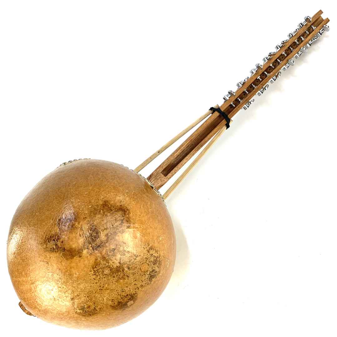Our professional Master Ngoni instruments are the product of high-quality contemporary workmanship paying respect to traditional West-African construction. Huge Niger calabash gourds are skinned with African cow hide to serve as the heart of these wonderful instruments. Premium hardwood sourced from West Africa and Australia is meticulously hand-carved to form the necks, bridges and handles. The 14 strings are made from competition-grade ultra low-stretch monofilament line. Finished with American-made, heavy duty tuning keys.