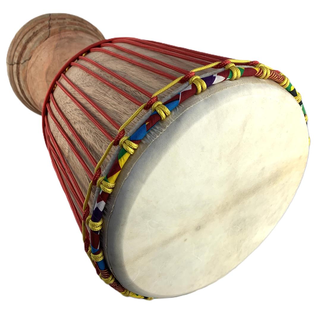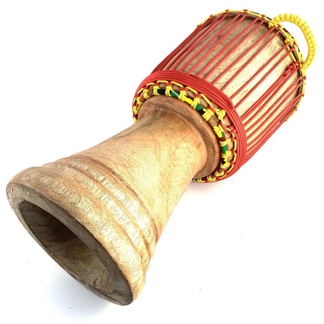 This African djembe was carved from Twenaboa in Ghana. Twenaboa is a medium density timber, lighter than hardwoods. These shells tend to have great bass ranges and offer great portability. Ghanaian carving styles usually result in twenaboa drums with low bass and strong slaps.
